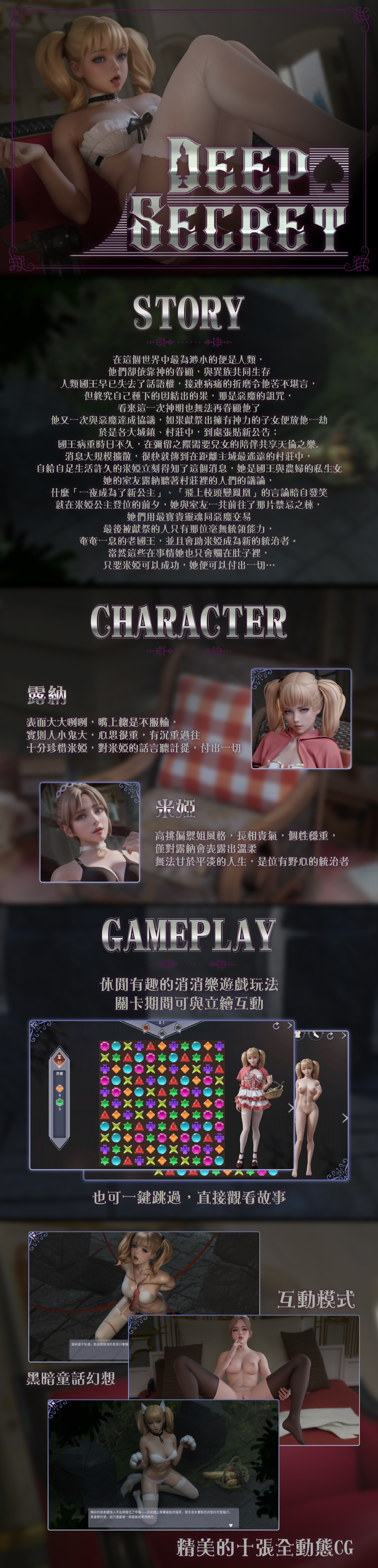 《Deep Secret》|製作社團:Lovely Games 休閒益智三消遊戲,鼠標連續選中兩個相鄰的方塊, 它們的位置會互換,互換後如果橫排或豎排有三個或以上相同方塊則消除。而成功後即可推進主角二人的劇情與故事發展!