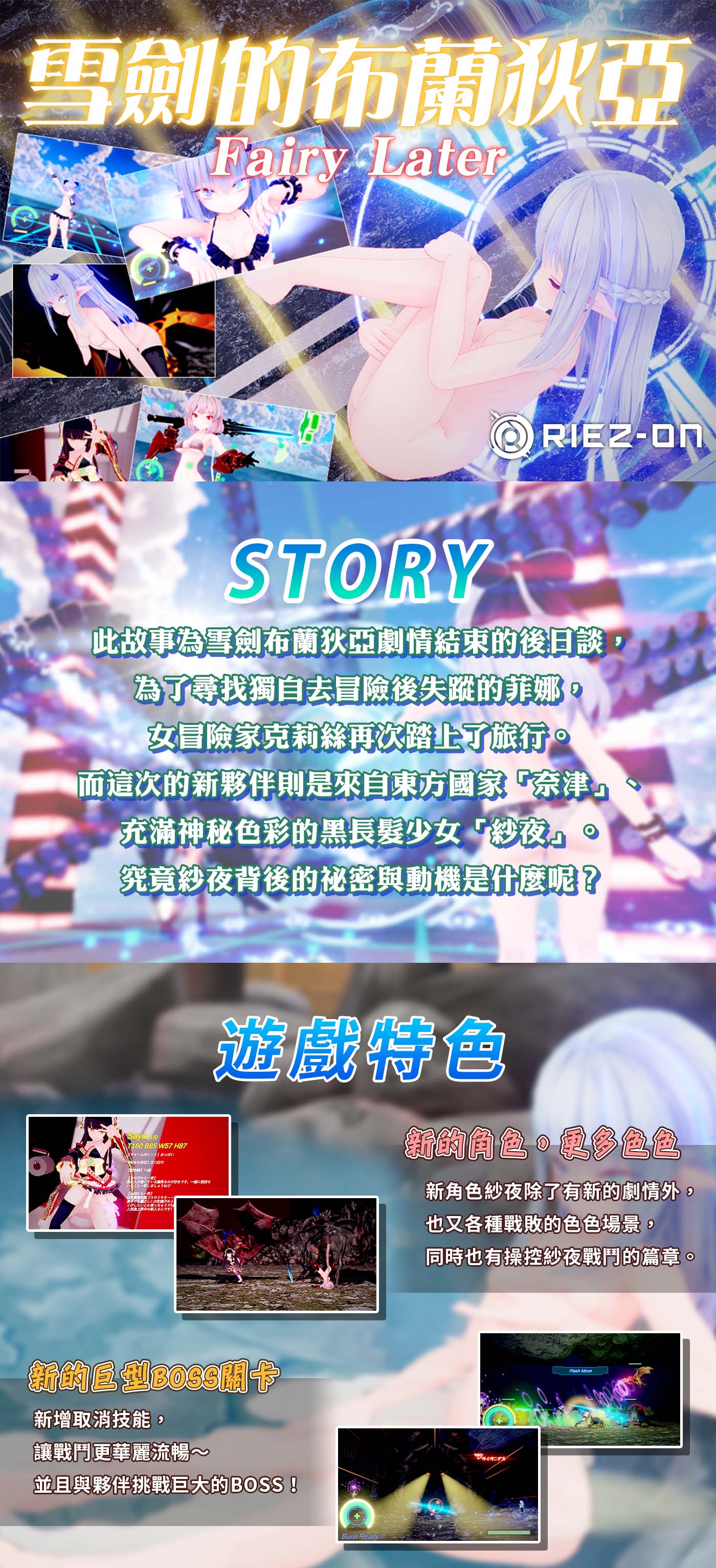 《スノウブランディア Fairy Later》|製作社團:Riez-ON 此故事為雪劍布蘭狄亞劇情結束的後日談, 為了尋找獨自去冒險後失蹤的菲娜, 女冒險家克莉絲再次踏上了旅行。 而這次的新夥伴則是來自東方國家「奈津」、 充滿神秘色彩的黑長髮少女「紗夜」。 究竟紗夜背後的祕密與動機是什麼呢?