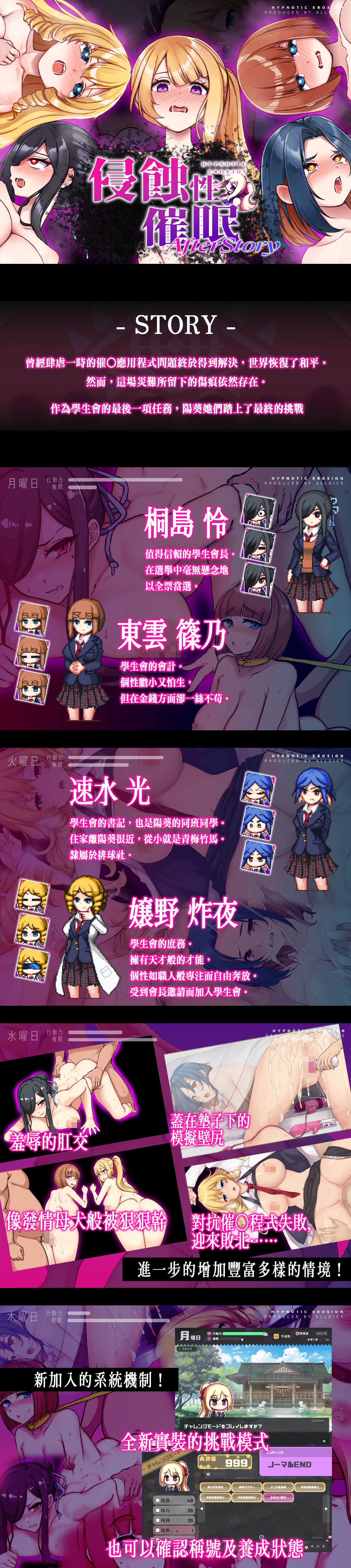 《侵蝕のヒプノシスAfterstory》|製作社團:ALLDICE 曾經肆虐一時的催○應用程式問題已經解決,世界終於迎來了和平。 然而,那場災難所留下的傷痕依然存在。 作為學生會的最後一項任務,日向一行人迎來了最後的挑戰。 ※中文版本BOKIBOKI獨佔發售!!