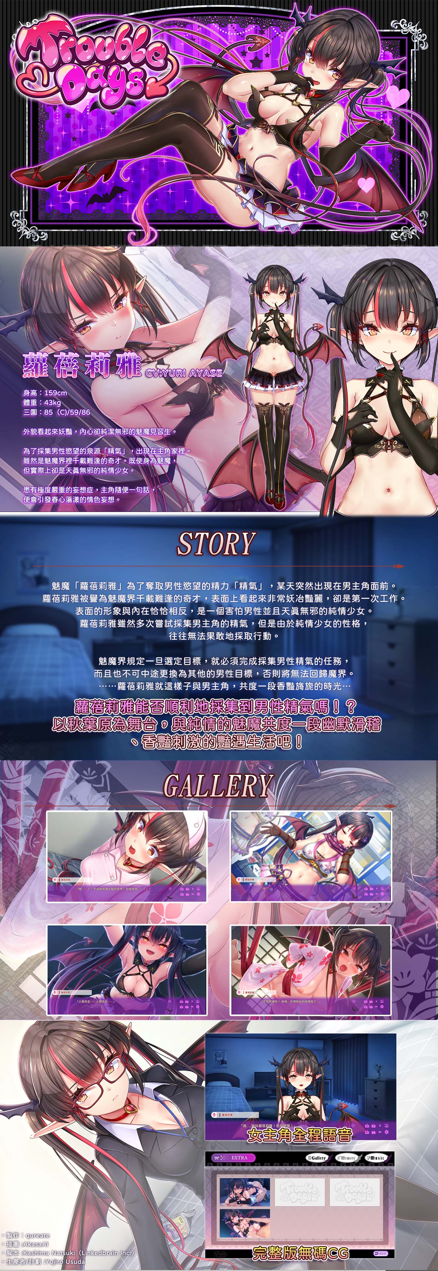 《TroubleDays》| 製作社團:qureate 魅魔『蘿蓓莉雅』為了奪取男性慾望的精力「精氣」,而來到了男主角的家中。 但因純情少女的個性,多次無法順利行動。 蘿蓓莉雅就這樣子與男主角,共度一段香豔旖旎的時光...